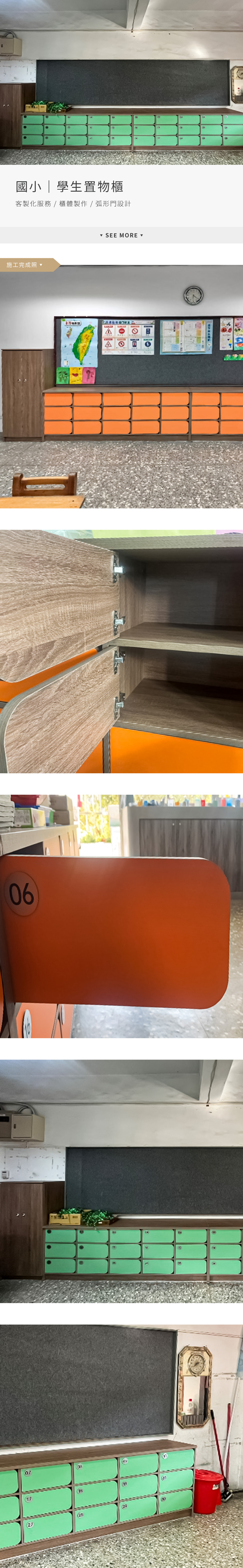 本案依據教室配置規劃學生置物櫃,結合分格收納與不同班級專屬配色設計,使學生物品清楚歸位、易於辨識,同時提升教室整齊度與管理效率。