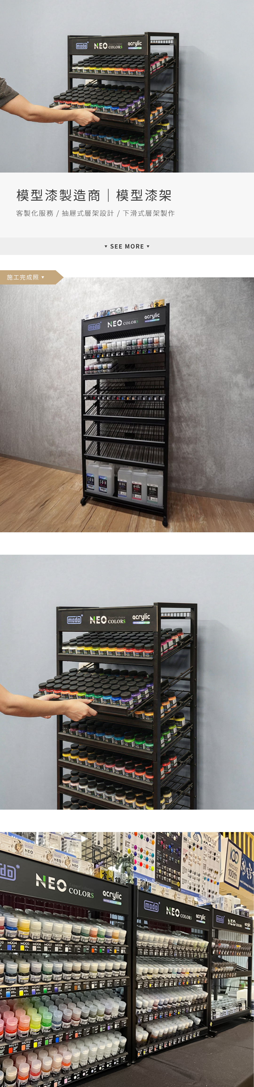 本案依據漆罐尺寸與使用情境,客製多層滑動式層架設計,強化分類清晰度與取用便利性,使陳列更有秩序,同時提升空間利用率與展示效果。
