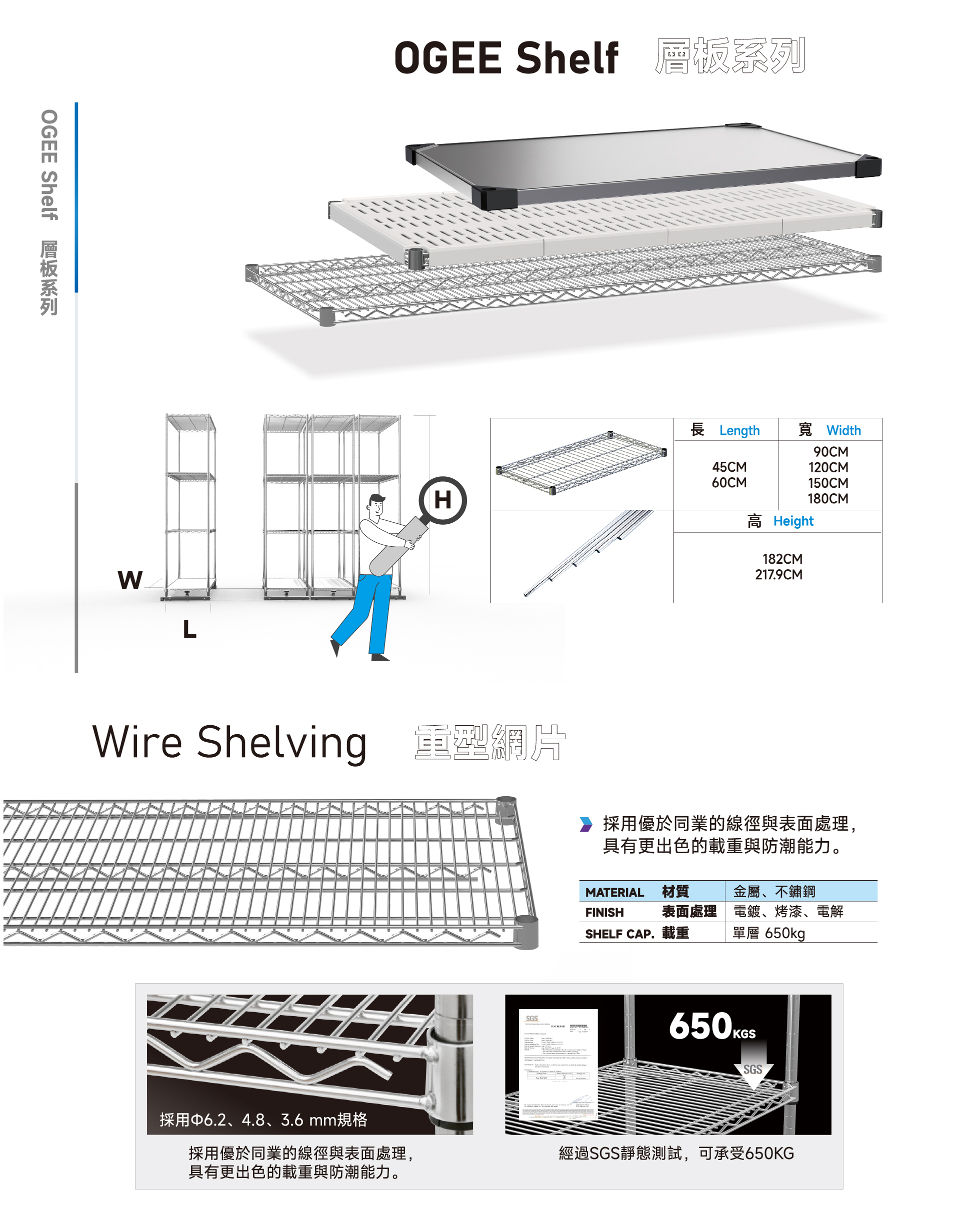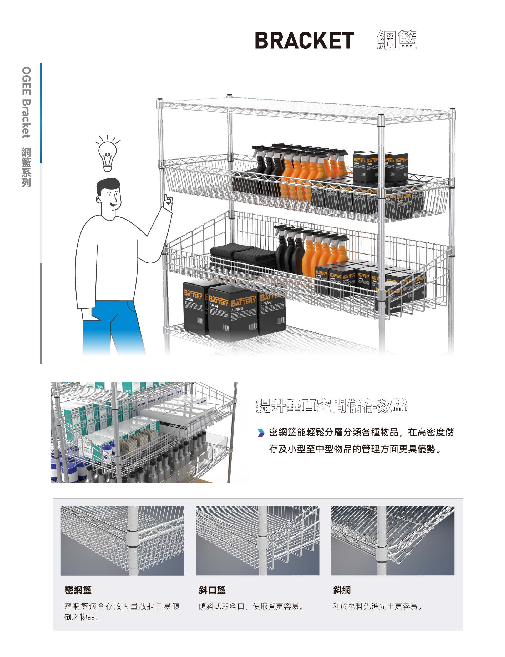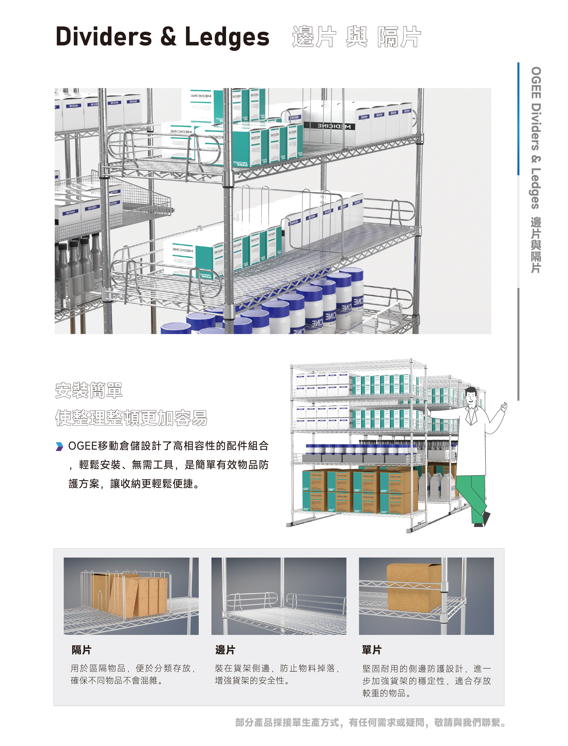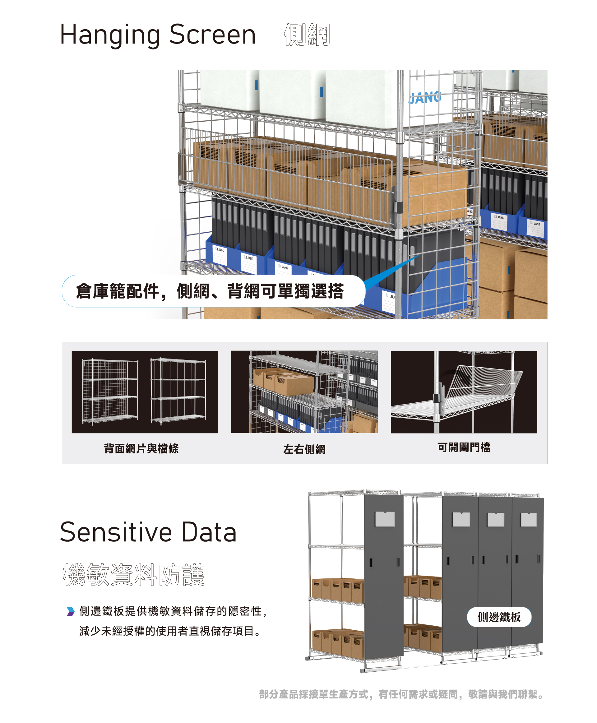 我們提供多種配件可靈活運用,邊片、PS底板、擋條、隔片等等,可防止物品從網片夾縫中掉落,也可使移動貨架時防止物品傾倒。
